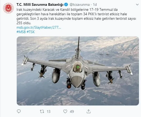 Muharip filo komutanlıklarından kalkan 20'ye yakın uçağın katıldığı, İHA'lar, SİHA'lar, Havadan Erken İhbar ve Kontrol (HİK) uçağı ile tanker uçaklarının görev aldığı Irak'ın kuzeyindeki Kandil ve Karacak bölgelerine yönelik 17-19 Temmuz'da düzenlenen harekatlarda 34 teröristin etkisiz hale getirildiği tespit edildi.