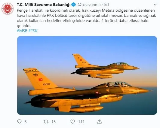 Milli Savunma Bakanlığı'ndan yapılan açıklamada "Pençe Harekâtı ile koordineli olarak, Irak kuzeyi Metina bölgesine düzenlenen hava harekâtı ile PKK bölücü terör örgütüne ait silah mevzii, barınak ve sığınak olarak kullanılan hedefler etkili şekilde vuruldu, 4 terörist daha etkisiz hale getirildi." denildi.