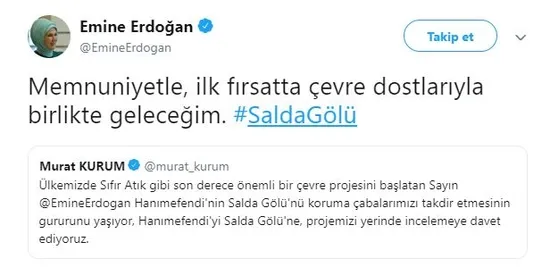Emine Erdoğan'ın paylaşımına Twitter üzerinden yanıt veren Bakan Murat Kurum, Emine Erdoğan'ı Salda Gölü'nde yapılan çalışmaları yerinde incelemeye davet etti. Kurum mesajında, "Ülkemizde Sıfır Atık gibi son derece önemli bir çevre projesini başlatan Sayın @EmineErdogan Hanımefendi'nin Salda Gölü'nü koruma çabalarımızı takdir etmesinin gururunu yaşıyor, Hanımefendi'yi Salda Gölü'ne, projemizi yerinde incelemeye davet ediyoruz." ifadelerine yer verdi.