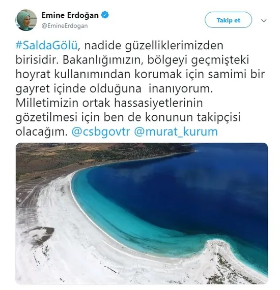 Başkan Recep Tayyip Erdoğan'ın eşi Emine Erdoğan, Twitter hesabından Çevre ve Şehircilik Bakanlığının Salda Gölü'ndeki çalışmalarına ilişkin paylaşımda bulundu.