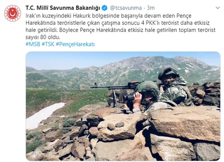 Bakanlıktan yapılan açıklamaya göre Pençe Harekâtında etkisiz hale getirilen toplam terörist sayısı 80 oldu.