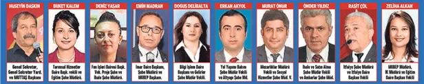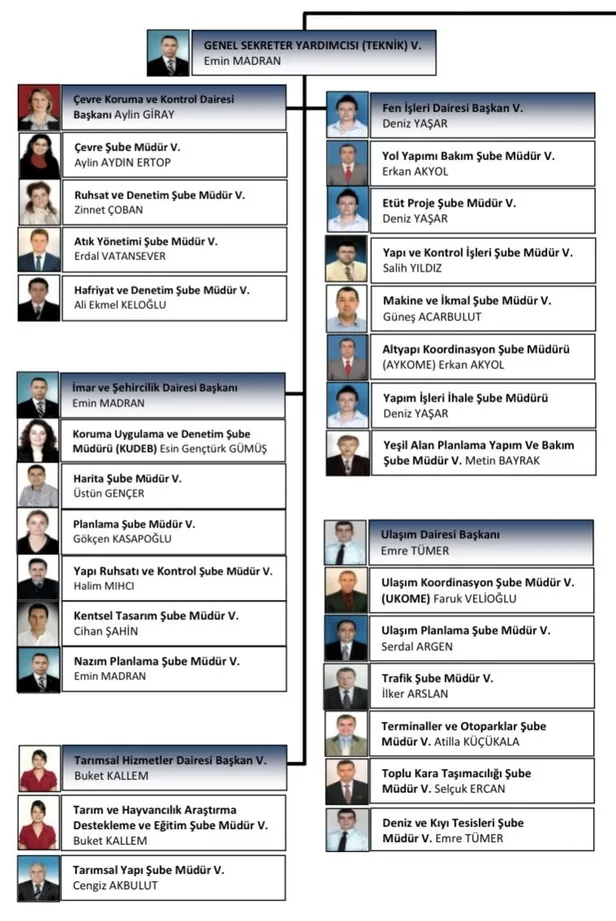 - Deniz Yaşar: Fen İşleri Dairesi Başkan Vekili, Etüt Proje Şube Müdür Vekili ve Yapım İşleri İhale Şube Müdürü.