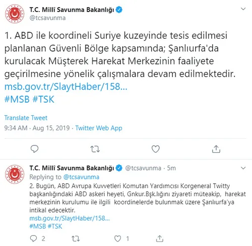 Bakanlıktan yapılan yazılı açıklamada, ABD ile koordineli olarak Suriye'nin kuzeyinde tesis edilmesi planlanan güvenli bölge kapsamında; Şanlıurfa'da kurulacak Müşterek Harekat Merkezi'nin faaliyete geçirilmesine yönelik çalışmalara devam edildiği bildirildi. Açıklamada, "Bugün, ABD Avrupa Kuvvetleri Komutan Yardımcısı Korgeneral Stephen Twitty başkanlığındaki ABD askerî heyeti, Genelkurmay Başkanlığını ziyareti müteakip, harekât merkezinin kurulumu ile ilgili koordine faaliyetinde bulunmak üzere Şanlıurfa'ya intikal edecektir" denildi.