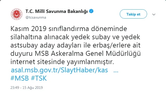 Yeni askerlik sisteminin yürürlüğe girişiyle birlikte birçok değişiklik meydana geldi. Yedek subay ve astsubaylar e-devlet üzerinden tercihte bulunup başvuru yapacaklar. Binlerce kişi bu konu hakkında bir açıklama beklerken bugün Milli Savunma Bakanlığı bir duyuru yayımladı. Kasım 2019 sınıflandırma döneminde sınıflandırma nitelik listesine (snl), yedek subay aday adayı, yedek astsubay aday adayı ile erbaş/er statüsündeki yükümlülerden; 20 Ağustos 2019 (dahil) tarihine kadar yoklamasını yaptıranlar, erken sevk müracaatında bulunan ve başvurusu kabul edilenler, erteleme ile sevk tehirleri sona erenler, dövizle/bedelli askerlik hizmeti Kapsamından çıkartılanlar, daha önceki celp dönemlerinden bakaya olanlar (sınıflandırılmamış olanlar) alınacaktır.