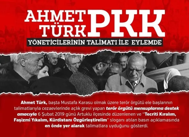 Ahmet Türk, başta Mustafa Karasu olmak üzere terör örgütü elebaşlarının talimatlarıyla cezaevlerinde açlık grevi yapan terör örgütü mensuplarına destek amacıyla 6 Şubat günü Artuklu ilçesinde ''Tecridi kıralım, faşizmi yıkalım, Kürdistanı özgürleştirelim'' sloganı atılan basın açıklamasında da en ön safta yer almıştı.