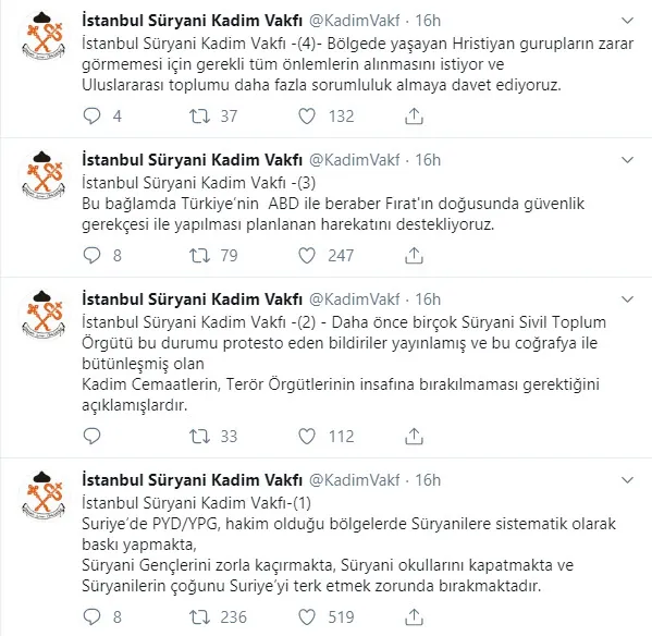 İstanbul Süryani Kadim Vakfı, Suriye’de PYD/YPG terör örgütlerinin, hakim olduğu bölgelerde Süryanilere sistematik olarak baskı yaptığını, Süryani gençleri zorla kaçırdığını ve Süryani okullarını kapatıp Süryanileri Suriye’yi terk etmek zorunda bıraktıklarını vurgulayarak Türkiye’nin Fırat'ın doğusunda güvenlik gerekçesi ile yapılması planlanan harekatını destekllediklerini bildirdi.