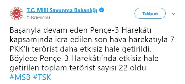 Başarıyla devam eden Pençe-3 Harekâtı kapsamında icra edilen son hava harekatıyla 7 PKK'lı terörist daha etkisiz hale getirildi. Böylece Pençe-3 Harekâtı'nda etkisiz hale getirilen toplam terörist sayısı 22 oldu.