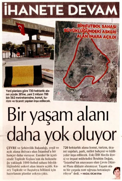 Terör örgütlerinin sesi olan ihanet gazetesi utanmadan Esenler'de donatı alanında kalan ve riskli durumdaki yaklaşık 40 bin konutun ve mücavir ilçedeki aynı durumdaki konutların transferinin sağlanacağı, Türkiye'nin en büyük millet bahçesini de kapsayan proje ile ilgili "İhanete devam. Bir yaşam alanı yok oluyor" suçlamasında bulundu.