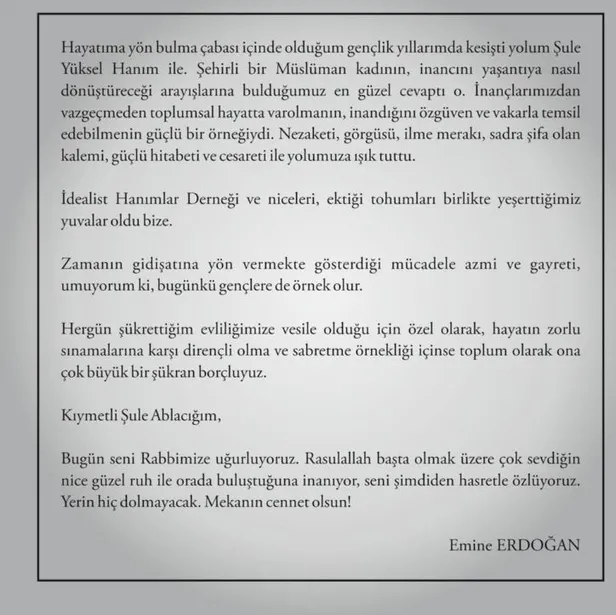 Başkan Recep Tayyip Erdoğan'ın eşi Emine Erdoğan, bugün toprağa verilen Şule Yüksel Şenler için yayınladığı mesajda "Her gün şükrettiğim evliliğimize vesile olduğun için şükran borçluyum" dedi.