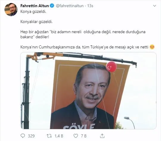 "Konya'nın Cumhurbaşkanımıza da, tüm Türkiye'ye de mesajı açık ve netti" ifadelerini kullanan Altun, Konyalıların, hep bir ağızdan, "Biz adamın nereli olduğuna değil, nerede durduğuna bakarız" dediklerini yazdı.