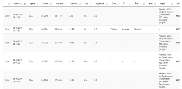 AFAD SON DEPREMLER (4 EYLÜL 2019)