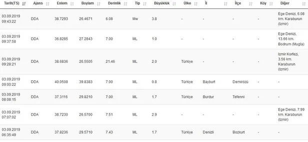 AFAD SON DEPREMLER (3 EYLÜL 2019)