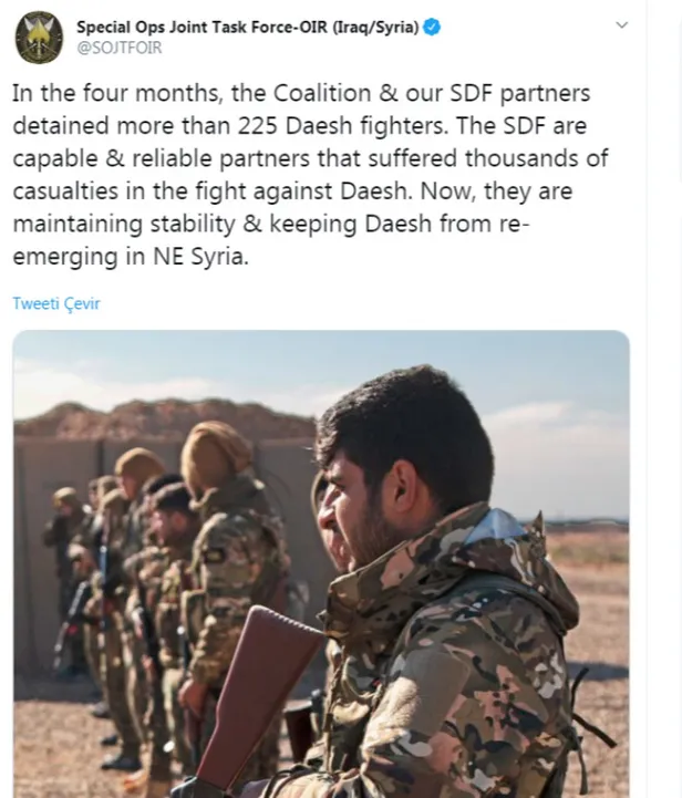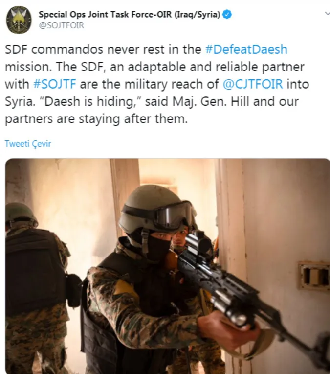 Irak ve Suriye'de IŞİD'e karşı ABD öncülüğünde kurulan Ortak Görev Kuvveti Özel Kuvvetler Komutanlığı'nın Special Ops Joint Task Force-OIR (Operation Inherent Resolve) resmi Twitter hesabından paylaşılan fotoğrafta alenen YPG/PYD'nin vazgeçilmezliğinin altı çiziliyor.