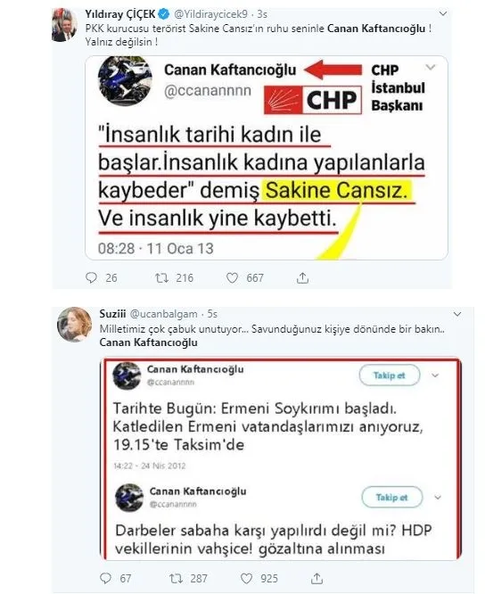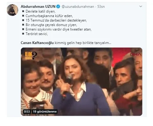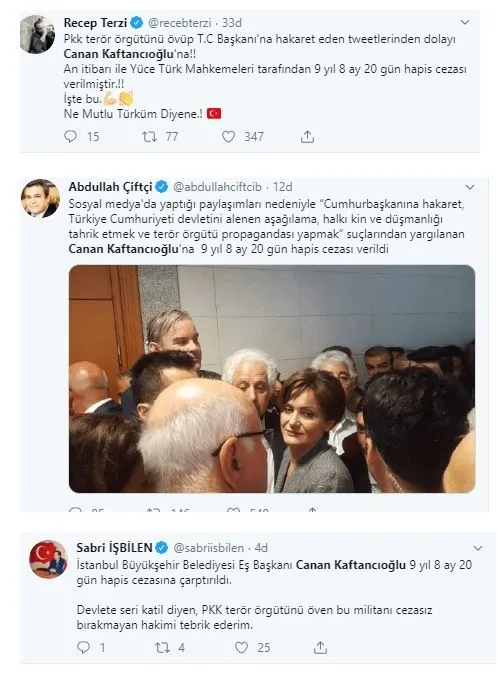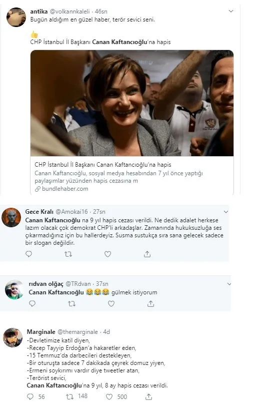 Sosyal medya hesabı üzerinden yaptığı paylaşımları nedeniyle yargılanan CHP İstanbul İl Başkanı Canan Kaftancıoğlu, "Silahlı terör örgütü propagandası yapmak" suçundan 1 yıl 6 ay, "kamu görevlisine hakaret" suçundan 1 yıl 6 ay 20 gün, "Cumhurbaşkanına hakaret" suçundan 2 yıl 4 ay, "Türkiye Cumhuriyeti devletini alenen aşağılama" suçundan 1 yıl 8 ay, "Halkı kin ve düşmanlığa tahrik etme" suçundan 2 yıl 8 ay olmak üzere toplam 9 yıl 8 ay 20 gün cezasına çarptırıldı. Mahkeme tutuklama kararı vermedi.