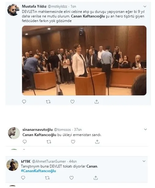 CHP İstanbul İl Başkanı Canan Kaftancıoğlu'nun, sosyal medyadaki bazı paylaşımları nedeniyle yargılandığı davada, 9 yıl 8 ay hapis cezasına çarptırılması Twitter'da gündem oldu. Kaftancıoğlu'nun mahkemede ifade verirken eli cebinde savunma yapmasına da sosyal medyadan tepki yağdı. Sosyal medya kullancılarından biri, "Canan Kaftancıoğlu, şuan hero tişörtü giyen FETÖ'cü'den farkın yok gözümde.." diye yazdı.
