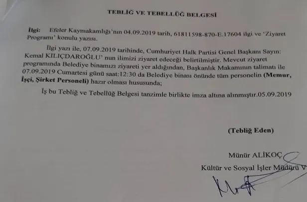 CHP'li Efeler Belediyesi'nde birim yöneticileri çalışanların 7 Eylül'de Kemal Kılıçdaroğlu'nu karşılamasını zorunlu tuttu. Çalışanlara imzalatılan tebliğ tebellüğ belgesinde memur, işçi ve şirket personellerinin 12.30'da belediye binası önünde olması istendi. Çalışanlara imzalatılan belgede, 'Başkanlık makamının talimatı olduğu' kaydedildi.