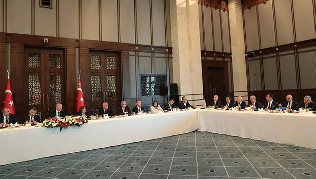 Başkan Recep Tayyip Erdoğan'ın daveti üzerine 30 şehrin Büyükşehir Belediye Başkanları bugün Külliye'de toplandı. Erdoğan'ın davet ettiği toplantıya AK Parti, CHP ve MHP'li başkanların yanı sıra kayyum olarak atanan isimler de katıldı. Toplantıda konuşan Başkan Erdoğan, "Belediye başkanlarının görevi devri sabık peşinde koşmak değil, en verimli hizmetleri getirmek için çalışmaktır." dedi. Erdoğan, belediyelerde işçi çıkarmalarına karşı da uyararak, "Belediye başkanlarının kurumlarını yönetme tasarrufu, ekmek paralarını kazanma peşindeki insanlarının hayatlarını altüst edebilecekleri anlamına gelmiyor. Ahı olan insanların üzerine ne siyaset ne hizmet inşa edilebilir" ifadelerini kullandı.