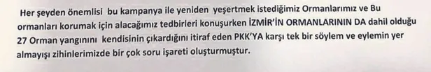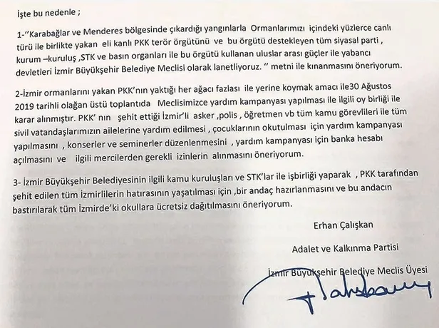 İzmir'deki son orman yangınlarının ardından geçtiğimiz günlerde yapılan Büyükşehir Meclis toplantısında AK Partili üye Erhan Çalışkan, "Karabağlar ve Menderes bölgesinde çıkardığı yangınlarla ormanlarımızı içindeki yüzlerce canlı türü ile birlikte yakan eli kanlı PKK terör örgütünü ve bu örgütü destekleyen tüm siyasal parti, kurum-kuruluş, STK ve basın organları ile bu örgütü kullanan uluslararası güçler ile yabancı devletleri İzmir Büyükşehir Belediye Meclisi olarak lanetliyoruz" metniyle PKK'nın kınanmasına ilişkin önerge verdi. Önergede yanan alanın ağaçlandırılması için belediyenin başlattığı kampanyanın yanında PKK'nın şehit ettiği İzmirli asker, polis, öğretmen gibi kamu görevlileri ile tüm sivillerin ailelerine yardım edilmesi için kampanya düzenlenmesi ve bu kampanya için banka hesabı açılması önerisi yer aldı.