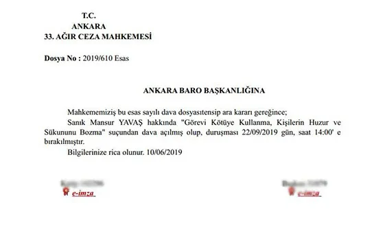 Ankara Büyükşehir Belediye Başkanı Mansur Yavaş hakkında, avukatlık yaptığı dönemde 600 bin dolarlık sahte senetle mükerrer tahsilat yapmaya çalıştığı iddiasıyla "Görevi kötüye kullanmak", senedi veren Necmettin Kesgin'e çok sayıda mesaj göndererek "Kişilerin huzur ve sükununu bozmak" suçundan soruşturma açılmıştı. Ankara Batı 4. Ağır Ceza Mahkemesince 23 Mayıs'ta verilen karar uyarınca iddianame yerine geçen karar yargılamayı yapacak olan Ankara 33. Ağır Ceza Mahkemesi'ne gönderilmişti. Bu karar kapsamında CHP'li Yavaş, bugün "sanık" sıfatıyla mahkemede hakim karşısına çıkacak. İddianame yerine geçen dosyadaki suçlamaya göre Yavaş 9 aydan 3 yıla kadar hapis istemiyle yargılanacak.