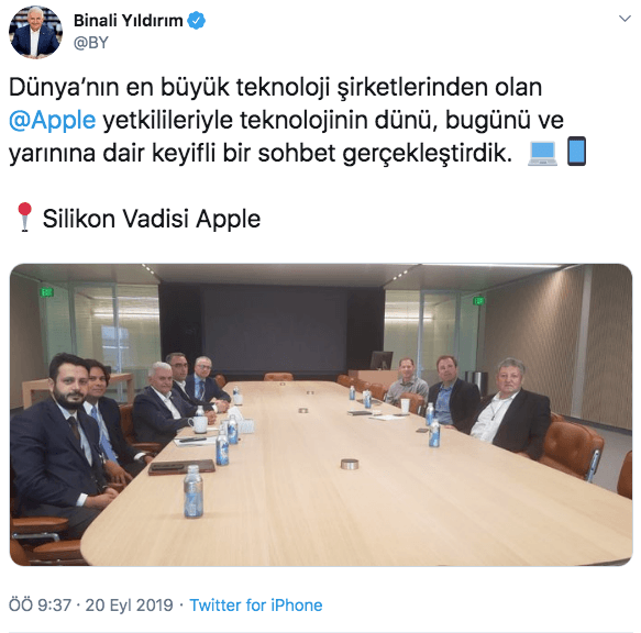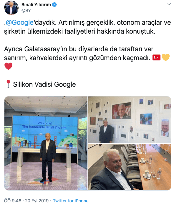 ABD'de Apple ve Google'ı ziyaret eden AK Parti İzmir Milletvekili Binali Yıldırım, Google yetkililerinin kendisine yaptığı jesti kişisel Twitter hesabında paylaştı.