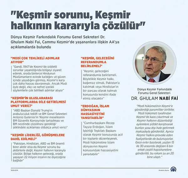 Fai, konuya ilişkin yaptığı yazılı açıklamada, Cumhurbaşkanı Erdoğan'ın, New York'ta devam eden BM Genel Kurulunda Keşmir meselesine ilişkin değerlendirmelerinin çok önemli olduğuna vurgu yaptı.