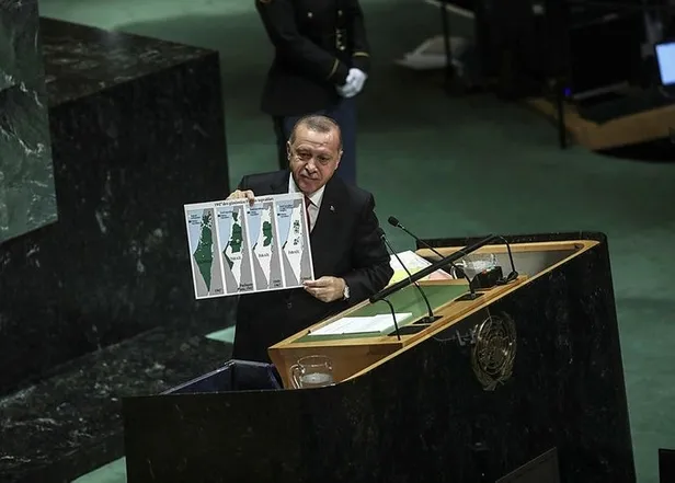 NASIL GASP EDEBİLİYOR?: Çözüm, 1967 sınırları temelinde, başkenti Doğu Kudüs olan bağımsız ve mütecanis topraklara sahip bir Filistin devletinin bir an önce kurulmasıdır. Bunun dışındaki herhangi bir barış planının adil olma, kabul edilme ve uygulanma şansı yoktur. Birleşmiş Milletler kürsüsünden soruyorum: İsrail devletinin sınırları neresidir? 1948 sınırları mıdır, 1967 sınırları mıdır, yoksa daha başka bir sınırı mı vardır? Tıpkı işgal edilen diğer Filistin toprakları gibi Golan Tepeleri ve Batı Şeria'daki yerleşim yerleri bu devletin sınırları içinde değilse nasıl oluyor da dünyanın gözü önünde gasbedilebiliyor?