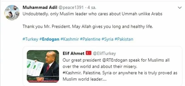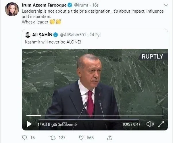 Pakistanlı politikacı Irum Azeem Farooque, Twitter hesabından, Erdoğan'ın konuşmasından Keşmir'le ilgili bölümü paylaşarak, "Liderlik bir sıfat veya unvanla ilgili değildir. Liderlik, etkililik ve nüfuzla ilgilidir. Ne lider ama!" ifadelerini kullandı.