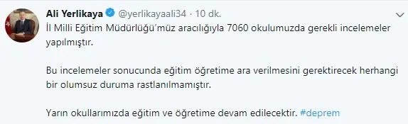 "İl Milli Eğitim Müdürlüğü'müz aracılığıyla 7060 okulumuzda gerekli incelemeler yapılmıştır. Bu incelemeler sonucunda eğitim öğretime ara verilmesini gerektirecek herhangi bir olumsuz duruma rastlanılmamıştır. Yarın okullarımızda eğitim ve öğretime devam edilecektir."