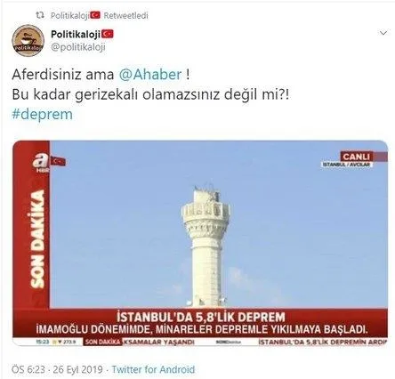 İstanbul'un Silivri ilçesi açıklarında bugün 5.8'lik bir deprem meydana geldi. Can kaybının yaşanmadığı depremin ardından bazı provokatiflerse boş durmadı. Sosyal medyadan algı operasyonu yaparak A Haber'i hedef aldı.