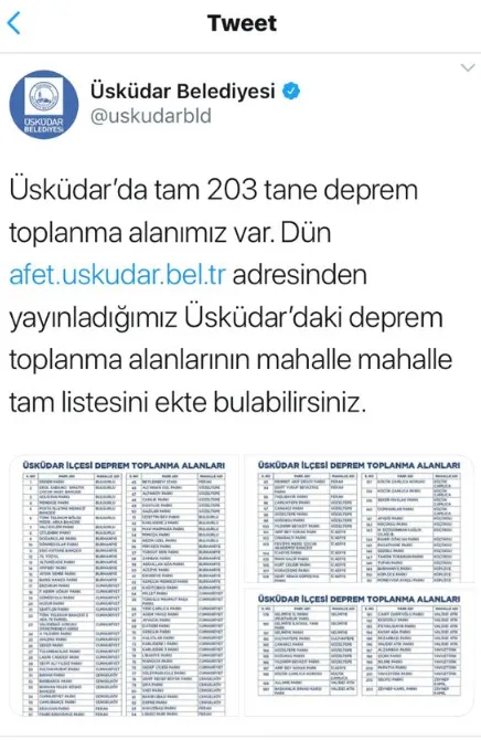 Üsküdar Belediyesi resmi Twitter hesabından yaptığı açıklamada sadece kendi ilçesine ait 203 deprem toplanma alanı olduğunu söyledi.