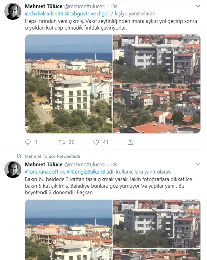 Tülüce daha sonraki paylaşımlarında Kaz Dağlarının eteklerinde 2,5 milyon zeytinlik kesildiğini bölgedeki Küçükkuyu Belediyesi olmak üzere tüm belediye başkanlarından hesap sorulması gerektiğini vurguladı.