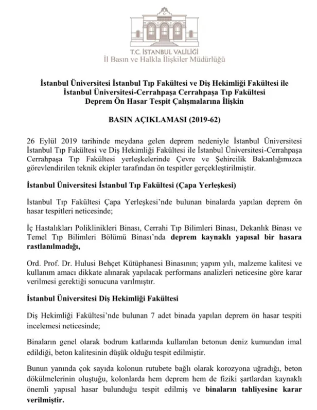Açıklamada, İstanbul Tıp Fakültesi Çapa Yerleşkesi'nde bulunan binalarda yapılan deprem ön hasar tespitleri neticesinde; İç Hastalıkları Poliklinikleri binası, Cerrahi Tıp Bilimleri binası, Dekanlık binası ve Temel Tıp Bilimleri Bölümü binasında deprem kaynaklı yapısal bir hasara rastlanmadığı belirtilirken, Ord. Prof. Dr. Hulusi Behçet Kütüphanesi binasının durumuna; yapım yılı, malzeme kalitesi ve kullanım amacı dikkate alınarak yapılacak performans analizleri ardından karar verileceği ifade edildi.