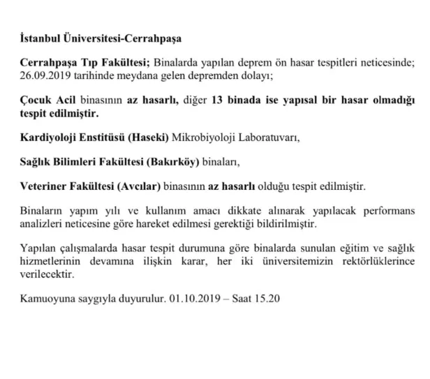 Açıklamada, "İstanbul Üniversitesi Kardiyoloji Enstitüsü (Haseki) Mikrobiyoloji Laboratuvarı, Sağlık Bilimleri Fakültesi (Bakırköy) binaları, Veteriner Fakültesi (Avcılar) binasının az hasarlı olduğu tespit edilmiştir. Binaların yapım yılı ve kullanım amacı dikkate alınarak yapılacak performans analizleri neticesine göre hareket edilmesi gerektiği bildirilmiştir. Yapılan çalışmalarda hasar tespit durumuna göre binalarda sunulan eğitim ve sağlık hizmetlerinin devamına ilişkin karar, her iki üniversitemizin rektörlüklerince verilecektir" ifadelerine yer verildi.