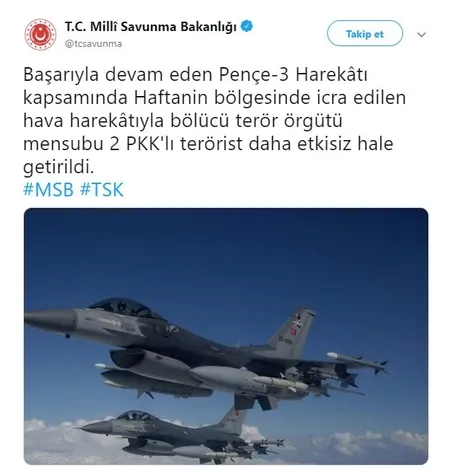 Milli Savunma Bakanlığı tarafından yapılan açıklamada "Başarıyla devam eden Pençe-3 Harekâtı kapsamında Haftanin bölgesinde icra edilen hava harekâtıyla bölücü terör örgütü mensubu 2 PKK'lı terörist daha etkisiz hale getirildi" ifadesi kullanıldı.