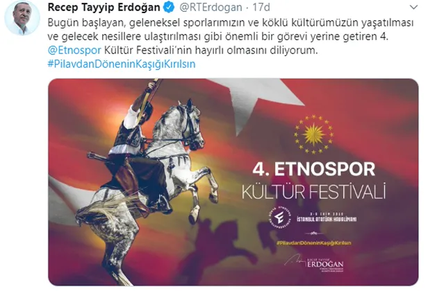 Erdoğan, Twitter hesabından yaptığı paylaşımda, "PilavdanDöneninKaşığıKırılsın" etiketini kullanarak, "Bugün başlayan, geleneksel sporlarımızın ve köklü kültürümüzün yaşatılması ve gelecek nesillere ulaştırılması gibi önemli bir görevi yerine getiren 4. Etnospor Kültür Festivali'nin hayırlı olmasını diliyorum." ifadelerini kullandı.