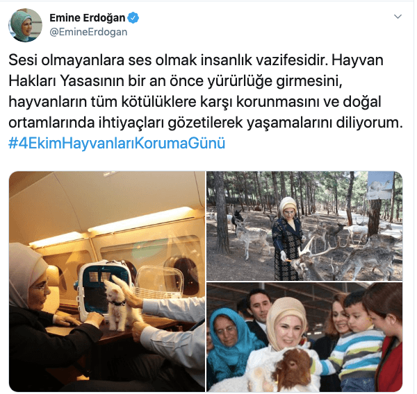 Cumhurbaşkanı Recep Tayyip Erdoğan'ın eşi Emine Erdoğan Hayvanları Koruma Günü dolayısıyla sosyal medya hesabından "#4EkimHayvanlarıKorumaGünü" etiketiyle paylaşımda bulundu.