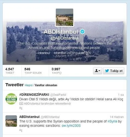 Gezi Parkı Olayları ile Türkiye'nin karıştırılmak istendiği dönemde de ABD tarafından skandal bir olaya imza atılmıştı. ABD Konsolosluğu'nun resmi Twitter hesabı üzerinden Gezicilerin kullandığı Twitter hesabının paylaşımı ReTweet edilmişti