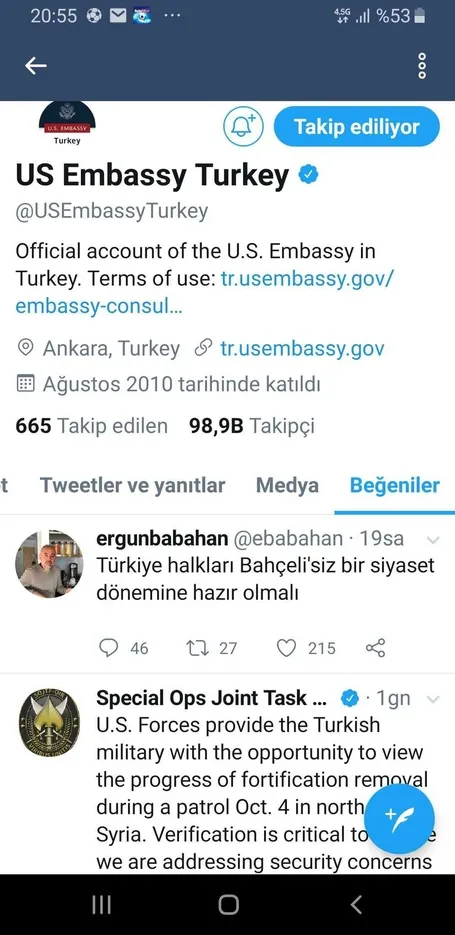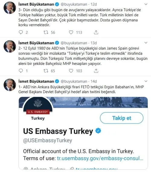 "1- ABD'nin Ankara Büyükelçiliği firari FETÖ tetikçisi Ergün Babahan'ın, MHP Genel Başkanı Devlet Bahçeli'yi hedef alan twitini beğendi.