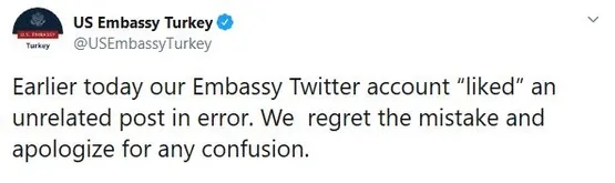 ABD Büyükelçiliği MHP'li vekiller ve sosyal medya kullanıcıları tarafından gösterilen tepkilerin ardından geri adım attı. Büyükelçilikten yapılan açıklamada tweetin yanlışlıkla beğenildiği ve yapılan hatadan dolayı özür diledikleri ifade edildi.