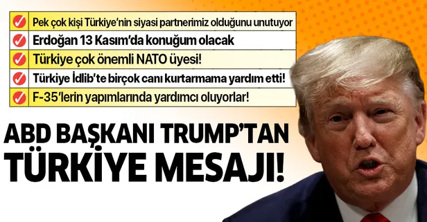 ABD Başkanı Trump, "Pek çok insan Türkiye'nin ABD'nin büyük bir ticaret ortağı olduğunu unutuyor, F-35'lerimizin çelik gövdesinin yapımında yardımcı oluyorlar. Ayrıca, İdlib'de birçok canı kurtarmamda bana yardım ettiler. İsteğim üzerine, uzun yıllar hapiste kalacak olan Rahip Brunson'u geri gönderdiler. Ayrıca en önemlisi, Türkiye'nin NATO'yu iyi durumda tutan önemli bir üye olduğunu unutmayın. Kendisi 13 Kasım'da ABD'ye misafirim olarak geliyor" dedi.