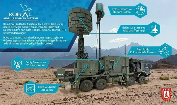 Koral, askeri araçlara entegre edilen ve geniş frekans bandında görev yapabilen bir radar sistemi. Milli ve yerli sistem olan Koral, radarları kör etmek, iletişimi kesmek ve diğer bilgisayarlı sistemleri işlevinden uzaklaştırmak için geliştirildi. Koral, bir elektronik destek aracı ve 4 elektronik taarruz aracından oluşuyor. Elektronik destek aracı, hedefi çok sıkı bir şekilde takip edip hangi bantta yayın yaptığını bulduktan sonra o banttaki elektronik taarruz aracına gereken bilgileri aktarılıyor. Ve hedef, elektronik taarruz aracı tarafından hedef işlevini yapamayacak hale getirilir. Yerli hava savunma sistemi Koral, Suriye sınır hattına sevk edilerek aktif hale getirilmişti. Sistemin menzilinin yaklaşık 200 kilometre olduğu belirtiliyor.