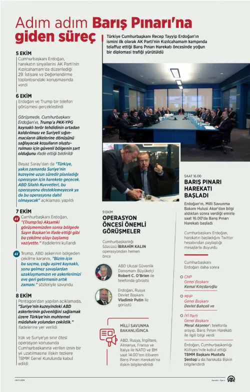 Saat: 19.40: Cumhurbaşkanı Erdoğan, Türk Silahlı Kuvvetleri tarafından saat 16.00'da Fırat'ın doğusunda başlatılan Barış Pınarı Harekatı'nı kurmayları ile birlikte takip ediyor. Cumhurbaşkanlığı tarafından paylaşılan fotoğraflarda, Cumhurbaşkanı Erdoğan'ın Milli Savunma Bakanı Hulusi Akar'dan bilgi aldığı görüldü. Hareket merkezindeki toplantıda, TBMM Başkanı Mustafa Şentop, İçişleri Bakanı Süleyman Soylu, Hazine ve Maliye Bakanı Berat Albayrak, Adalet Bakanı Abdulhamit Gül, Genelkurmay Başkanı Orgeneral Yaşar Güler ve Milli İstihbarat Teşkilatı Başkanı Hakan Fidan'ın da bulunduğu görüldü.
