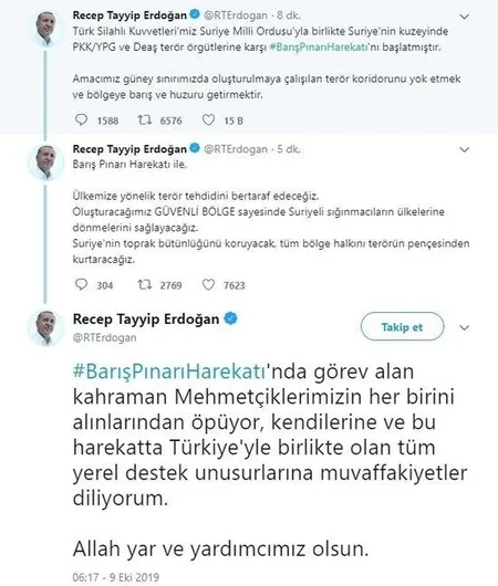 Cumhurbaşkanı Erdoğan, Twitter hesabından paylaştığı mesajla harekatı dünyaya ilan etti. Erdoğan'ın tweetinden dakikalar önce Türk savaş uçakları Ceylanpınar'ın karşısındaki Rasulayn'daki terör hedeflerini vurdu. Bugün saat 16.10'da Cumhurbaşkanı Erdoğan Twitter hesabından operasyonun başladığını ilan etti.