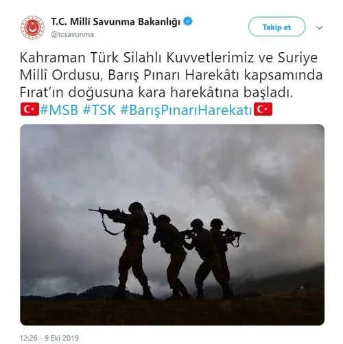 Saat 17.10 : Milli Savunma Bakanlığı Twitter hesabından açıklama yaptı: "Kahraman Türk Silahlı Kuvvetleri, Fırat'ın doğusunda #BarışPınarıHarekatı'na başladı."