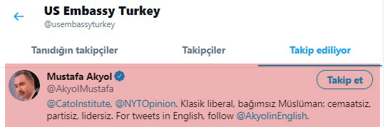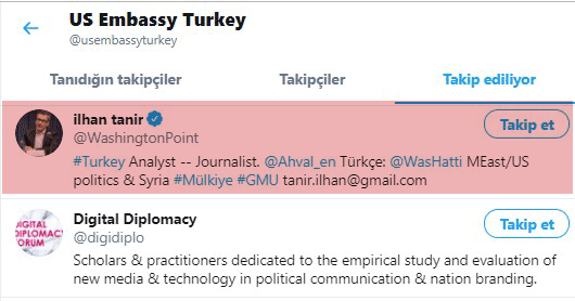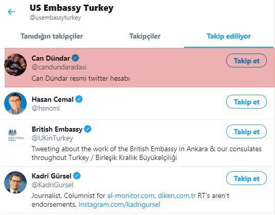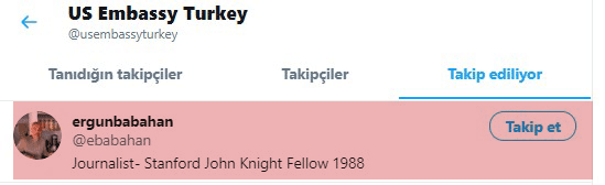 Büyükelçiliğin sosyal medyada takip ettiği FETÖ hesapları Ergun Babahan ile sınırlı kalmadı. Elçilik hesabının takipçi listesinde Emre Uslu, Can Dündar, İlhan Tanır, Mehmet Baransu, Mustafa Akyol, Gürcan Balık gibi FETÖ üyeleri de yer alıyor. Babahan'ın tweetinin beğenilmesinin ardından özür üstüne özür dileyen ABD Büyükelçiliğinin, takip edilen hesaplar ile ilgili bir işlem yapmaması ise özrünün ne kadar samimi olduğunu bir kez daha gözler önüne serdi.