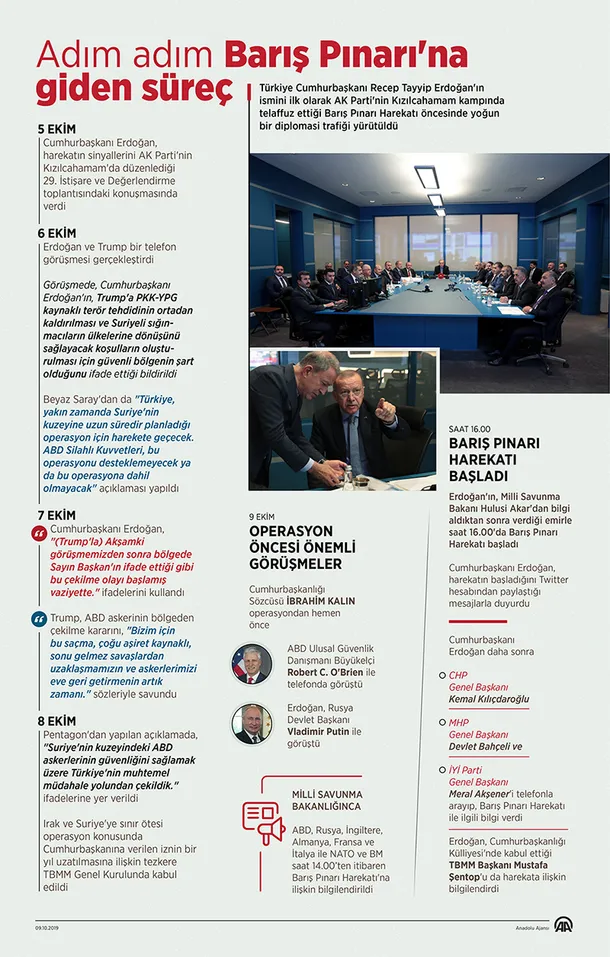 Hava harekatları ve kara ateş destek vasıtalarıyla başlayan Barış Pınarı'nda saat 22.00 itibarıyla kara harekatı safhasına geçildi. Silahlı Kuvvetler Komuta ve Harekat Merkezi'nden harekatı sevk ve idare eden Akar ve TSK Komuta Kademesi'nin uzun mesaisi gece boyunca devam etti.