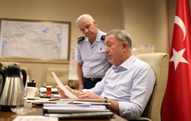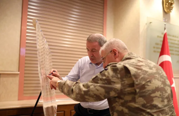 Bölgeden gelen anlık görüntüler üzerinden harekatı anbean takip eden Akar, beraberindeki Genelkurmay Başkanı Orgeneral Yaşar Güler ve Kara Kuvvetleri Komutanı Orgeneral Ümit Dündar ile talimatlar verdi.