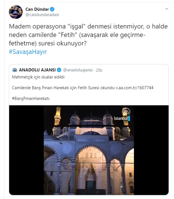 Türkiye Barış Pınarı Harekatı ile kenetlenmişken vatan haini Can Dündar, askerlerimizin başarılı olması için okunan Fetih Suresi'ni hedef aldı. Dündar, sosyal medya hesabından “Madem işgal denmesini istemiyorsunuz, neden Fetih suresi okuyorsunuz?” ifadelerini kullandı.