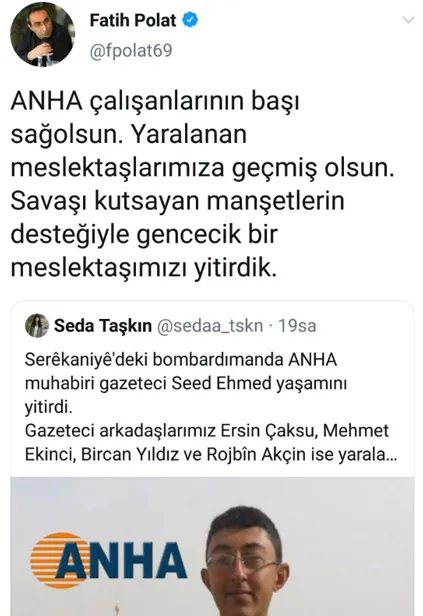 Türkiye'nin Fırat'ın doğusuna başlattığı Barış Pınarı Harekatı'na karşı yapılan manipülasyonların ardı arkası kesilmiyor. Türkiye'nin harekat sırasında ANHA'da çalışan bir gazeteciyi öldürdüğü iddiaları yine boş çıktı. Sözde gazeteci olduğu için öldürüldüğü iddia edilen kişinin PKK kıyafetleri ve elinde silah ile çekilen fotoğrafları sosyal medyada paylaşılmaya başlandı. Öte yandan bu manipülasyona terör yandaşı Evrensel gazetesi yazarı Fatih Polat da katıldı.