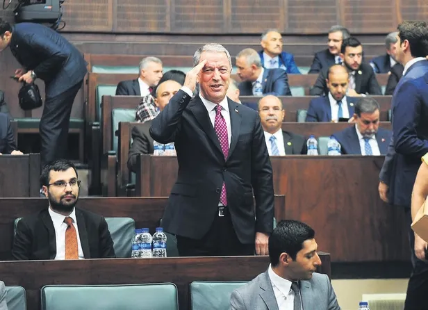 Milli Savunma Bakanı Hulusi Akar, AK Parti Grup Toplantısı'na katıldı. "Hulusi baba bizi Suriye'ye götür" diyenlere asker selamını yolladı.